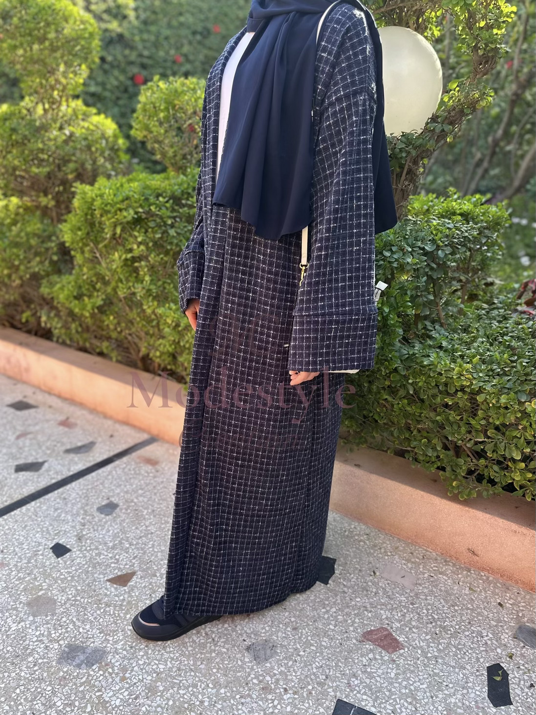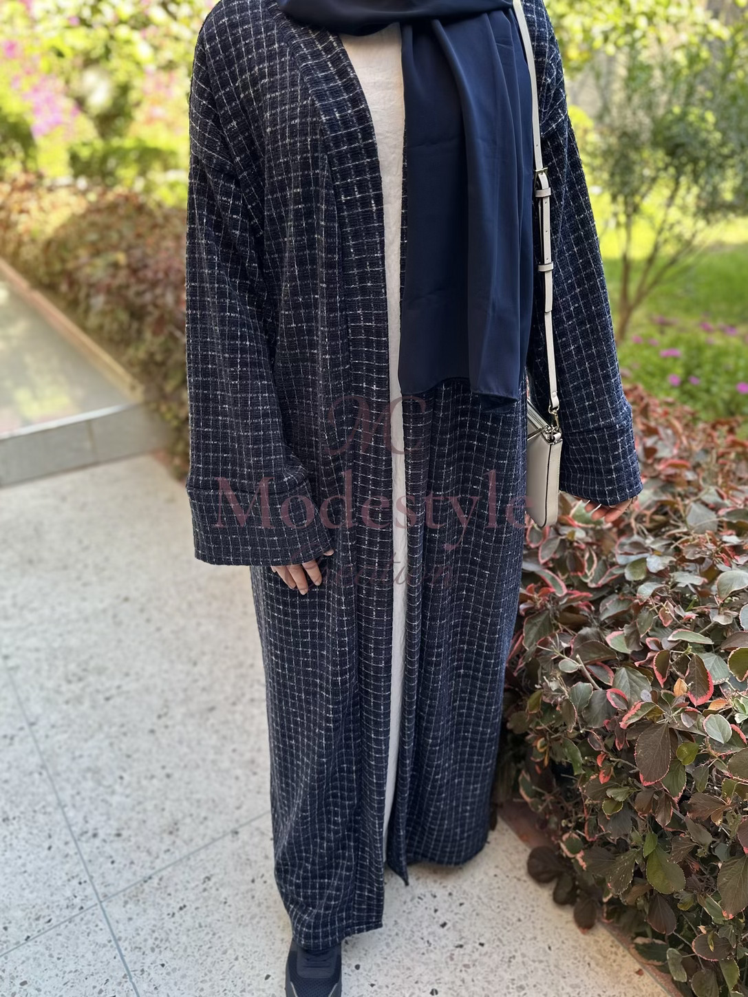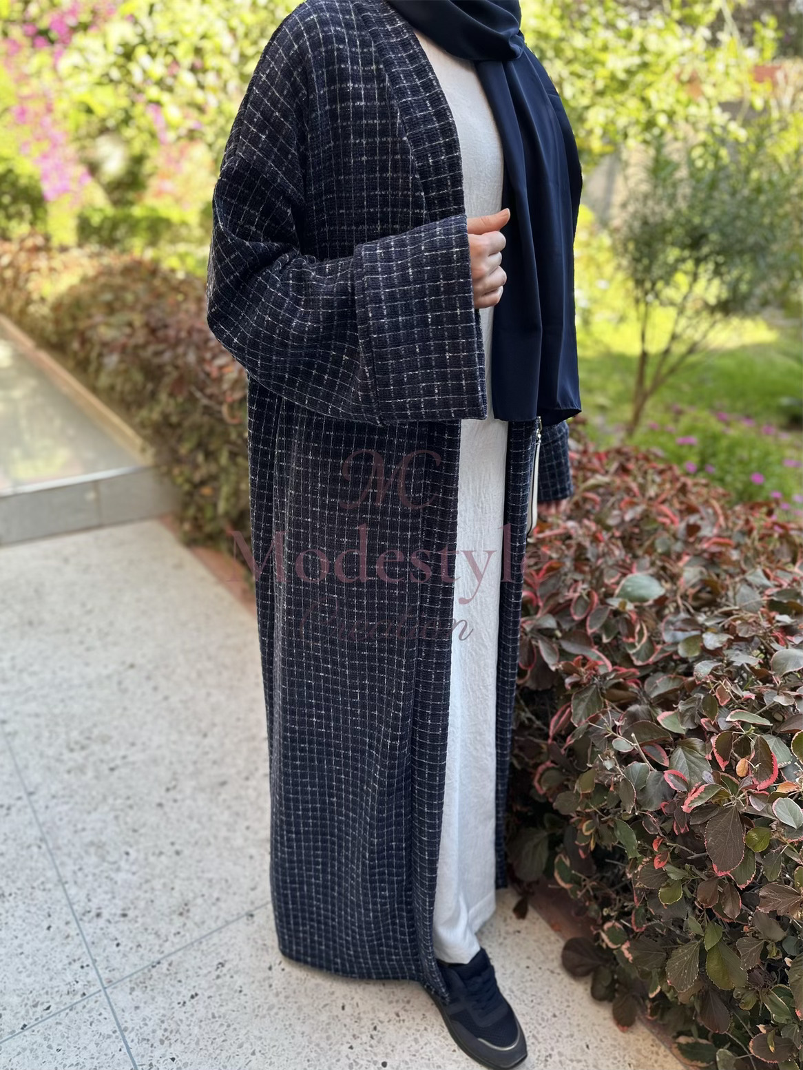 Abaya en tissu Chanel, élégante et pratique pour toutes vos occasions. Elle peut se porter en style casual avec un pantalon ou classy avec une robe en dessous.